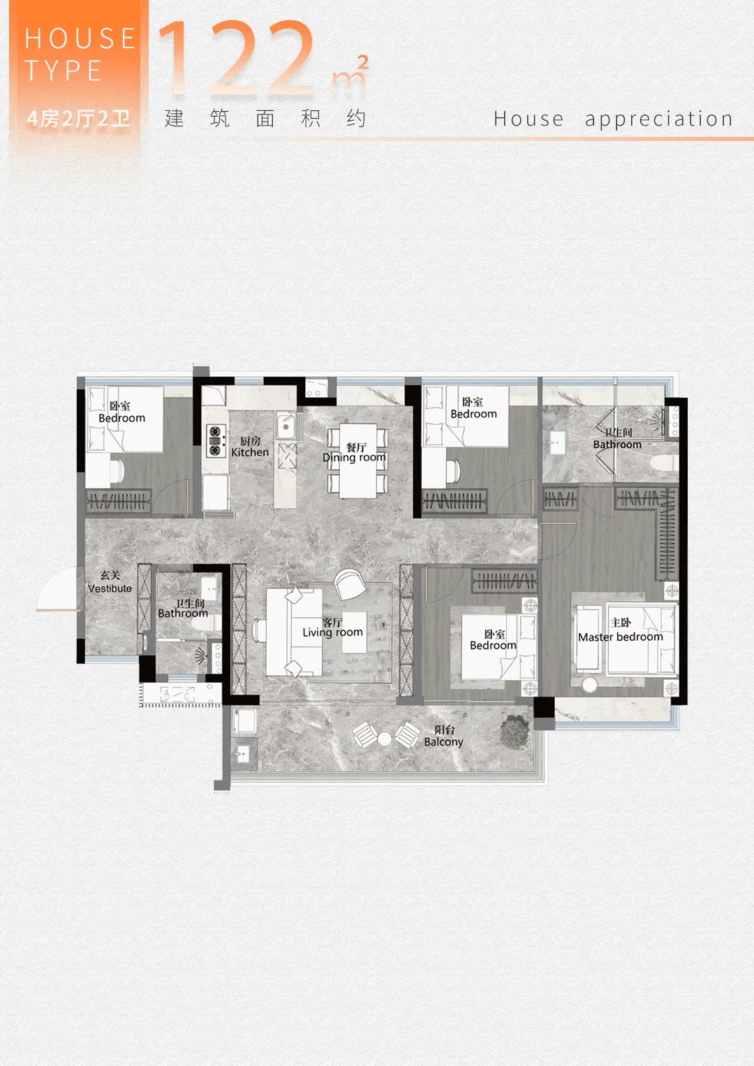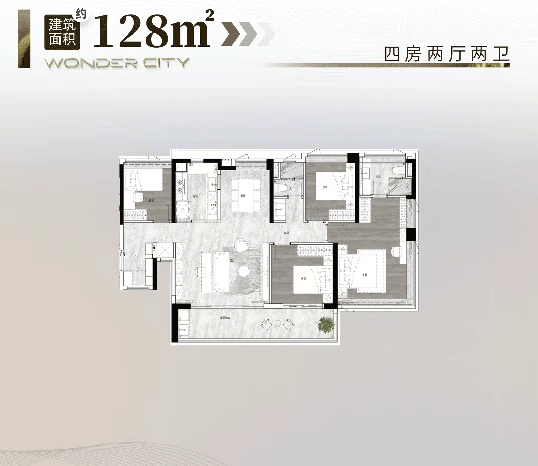 建面约128㎡户型为四房两厅两卫,无论是一期已售的户型仍是即将推出的二期户型,核心水院两侧采用巴西奢石,让孩子能享遭到优良的教育资本。